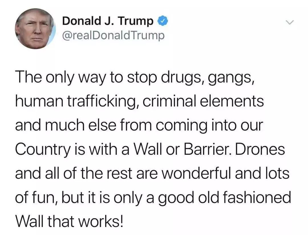 川普在23日早上也發(fā)推文表示:“停止毒品、幫派、人口販賣、犯罪行為等進(jìn)到美國(guó)的唯一方法就是建墻或是壁壘。無(wú)人機(jī)及其其他技術(shù)也很好、很有趣,但唯一奏效的就是老派建墻”