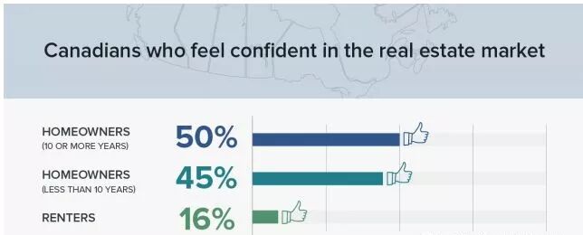 調(diào)查結(jié)果表明,“房齡”較長的加拿大人中,50%對房市有信心;“房齡”較短的加拿大人中,46%對房市有信心;但是無房的租戶中,只有16%的人這么認(rèn)為。