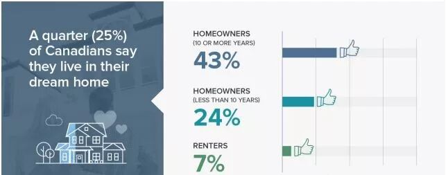 此外,“房齡”越長的業(yè)主越喜歡自己的房子:10年及以上“房齡”的加拿大業(yè)主中,高達(dá)43%的人認(rèn)為現(xiàn)在住的房子就是他們的“夢之屋”;“房齡”不足10年的加拿大業(yè)主中有24%的人這么認(rèn)為;而租房者中,則只有7%的人有這個感覺。