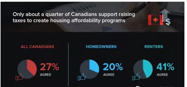 但是,一旦提到通過收稅或加稅的辦法來改善房屋負(fù)擔(dān)能力,加拿大人就不是那么積極了,全部加拿大人中,只有27%同意,業(yè)主特別對此不感興趣,也許居住條件相對較差的緣故,對此表示贊成的租戶倒是多得多: