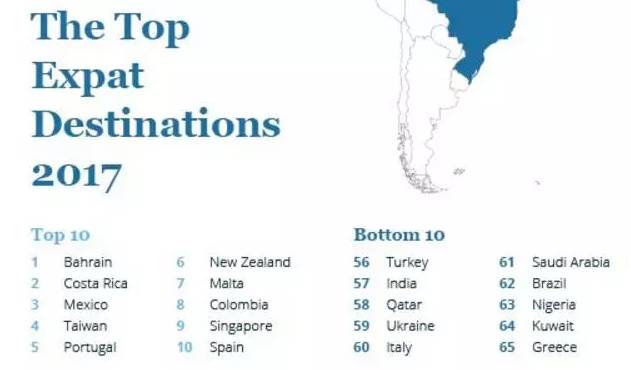 根據(jù)InterNations的統(tǒng)計(jì),世界上目前最適合生活的海外十大地區(qū)為,巴林島,哥斯達(dá)黎加,墨西哥,中國(guó)臺(tái)灣,葡萄牙,新西蘭,馬耳他,哥倫比亞,新加坡和西班牙。