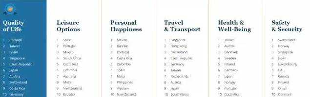 在新移民的生活質(zhì)量方面,報(bào)告也做了詳細(xì)劃分。該排名綜合了在這些地區(qū)的海外人士平時(shí)生活閑暇時(shí)間的活動(dòng)選擇,快樂程度,旅游,交通,健康,福利,安全等元素綜合而成。西班牙是外籍人士工作之外可以選擇活動(dòng)最多的地區(qū),墨西哥是最快樂的地區(qū),旅游和交通最方便的是新加坡,健康福利最好的是中國(guó)臺(tái)灣,治安安全評(píng)價(jià)最好的是瑞士。