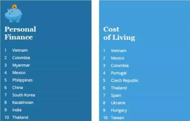 在新移民可以接受的物價(jià)方面,越南,墨西哥,哥倫比亞,葡萄牙,捷克,泰國(guó),西班牙,烏克蘭,匈牙利,中國(guó)臺(tái)灣這些地區(qū)都讓新移民感到非常舒服。在新移民個(gè)人理財(cái)自由度(生活之外可消費(fèi)的存款)方面,越南,哥倫比亞,緬甸,墨西哥,菲律賓,中國(guó),韓國(guó),哈薩克斯坦和印度位列前10。