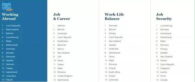 就業(yè)方面,對(duì)于新移民來說,工作相對(duì)最好就業(yè)的國(guó)家前三名是捷克,新西蘭和巴林島。在這些國(guó)家,無論是工作的安全性,工作生活的平衡性,還是個(gè)人職場(chǎng)的發(fā)展,都是不錯(cuò)的。