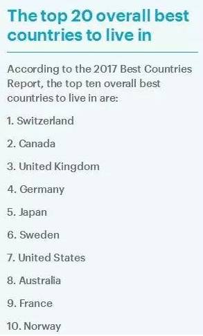 據(jù)了解,最宜居國(guó)家榜單評(píng)選活動(dòng)已經(jīng)舉辦了兩年,今年瑞士拿下榜首,緊隨其后的第2至10名分別是:加拿大、英國(guó)、德國(guó)、日本、瑞典、美國(guó)、澳大利亞、法國(guó)、挪威。