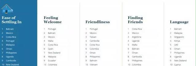 巴林島,墨西哥,哥斯達(dá)黎加都是最容易移居的地區(qū);葡萄牙成為最歡迎外國(guó)人移居的國(guó)家,同時(shí)也成為居民最友好國(guó)家;哥斯達(dá)黎加成為最容易和本地人成為朋友的國(guó)家;另外巴林島也被稱作最沒有語言障礙的國(guó)家。