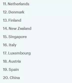 第11至20名是:荷蘭、丹麥、芬蘭、新西蘭、新加坡、意大利、盧森堡、奧地利、西班牙、中國(guó)。由下圖可以看出許多歐洲國(guó)家身在其中,這種評(píng)選其實(shí)不光拘泥于軍事實(shí)力等傳統(tǒng)角度,而是從更加多元的角度,諸如教育等方面去看一個(gè)國(guó)家的經(jīng)濟(jì)繁榮程度。