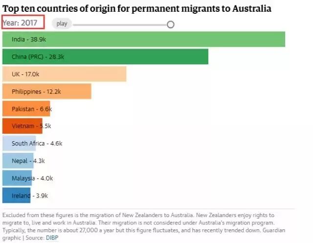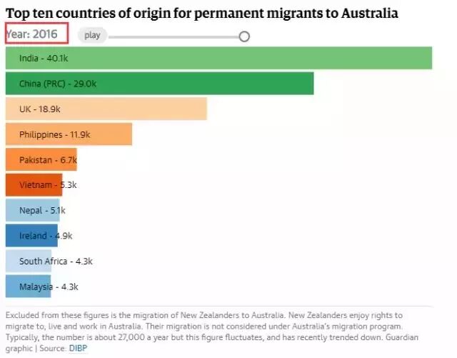 過去二十年來,澳大利亞永居移民的主要來源國已經(jīng)發(fā)生了變化,之前大多移民是來自英國、南非等地,現(xiàn)在已經(jīng)變成中國及印度。主要來看下2016和2017年的數(shù)據(jù)統(tǒng)計: