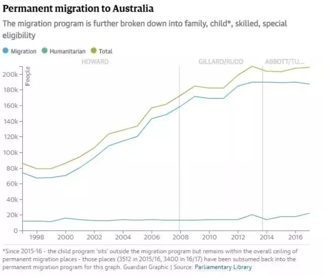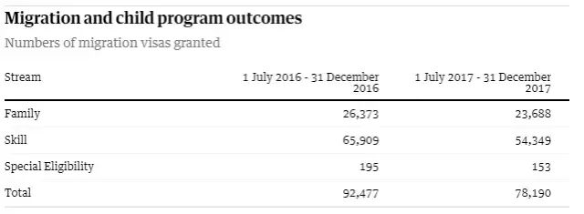 據(jù)澳大利亞《衛(wèi)報》報道,上個財政年度移民降至18.3萬人,今年還將進一步下降。參議院估計的數(shù)字,與《衛(wèi)報》在信息自由法之下獲得的簽證統(tǒng)計數(shù)字顯示,2017-18年度發(fā)放的簽證數(shù)量可能為16.5萬份,是7年來的最低水平。