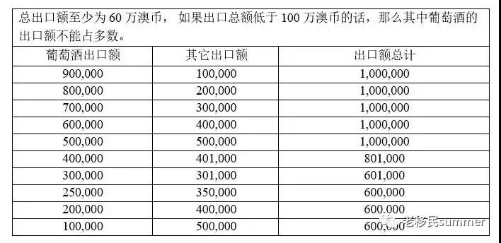 在2018年7月1日之后獲得南澳州提名的、非偏遠(yuǎn)區(qū)域的55歲以下132簽證持有人,出口額至少要達(dá)到60萬(wàn)澳幣, 如果出口總額低于100萬(wàn)澳幣的話(huà),要是做葡萄酒類(lèi)的生意的話(huà),出口額度不能占多數(shù)。那具體的是什么概念呢?看下面!