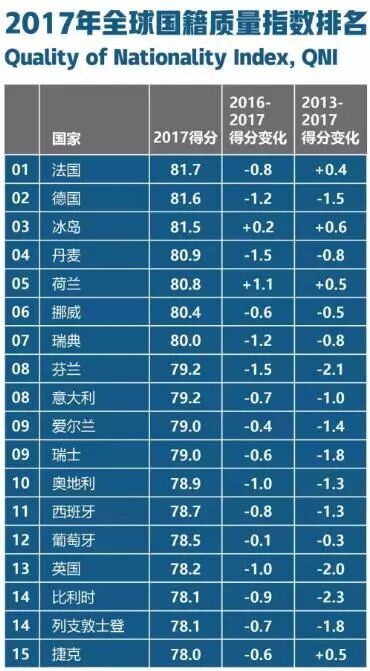 國籍質(zhì)量指數(shù)即Quality of Nationality Index(簡稱QNI),這個指數(shù)的衡量標(biāo)準(zhǔn)分為國籍的內(nèi)部價值和外部價值。前者包括國家的經(jīng)濟(jì)實(shí)力、人類發(fā)展(如居民平均壽命、受教育情況、生活質(zhì)量等)、以及社會平穩(wěn)性三大方面;后者包括在其他國家自由旅行、定居的權(quán)利,也就是“護(hù)照含金量”——護(hù)照排名就是這個意思。