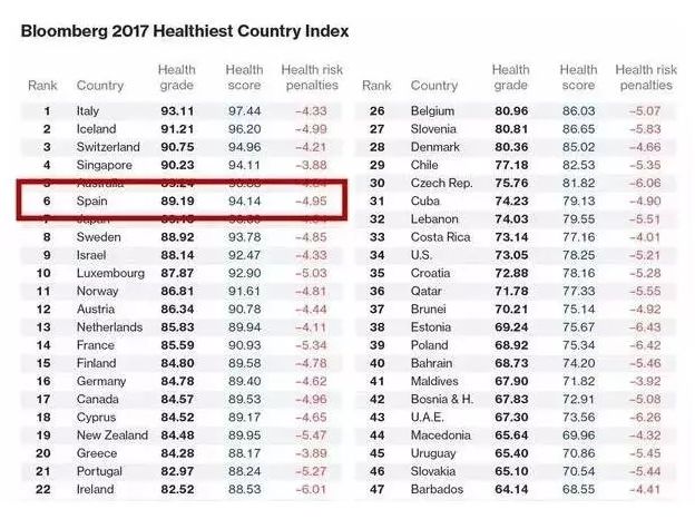 據(jù)Bloomberg新聞社發(fā)布的2017年全球健康國家指數(shù)排名中,西班牙上榜全球最健康的國家Top10榜單,排名第6,健康度高達(dá)89.19分,人均壽命超過80歲。人均壽命排名歐洲第二,世界第四,也是世界上最適宜養(yǎng)老的國家之一。