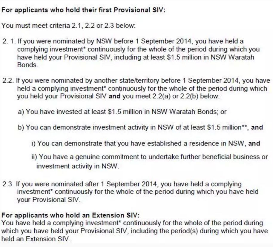 如果是在2014年9月1日之前獲得州提名,需證明在188C簽證持有期間,在澳洲保持500萬澳幣的合規(guī)投資,其中至少150萬澳幣投資到新州Waratah債券;