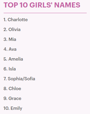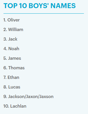 在澳洲,平均每10個寶寶中,就有一個起的是上面這20個名字中的一個。