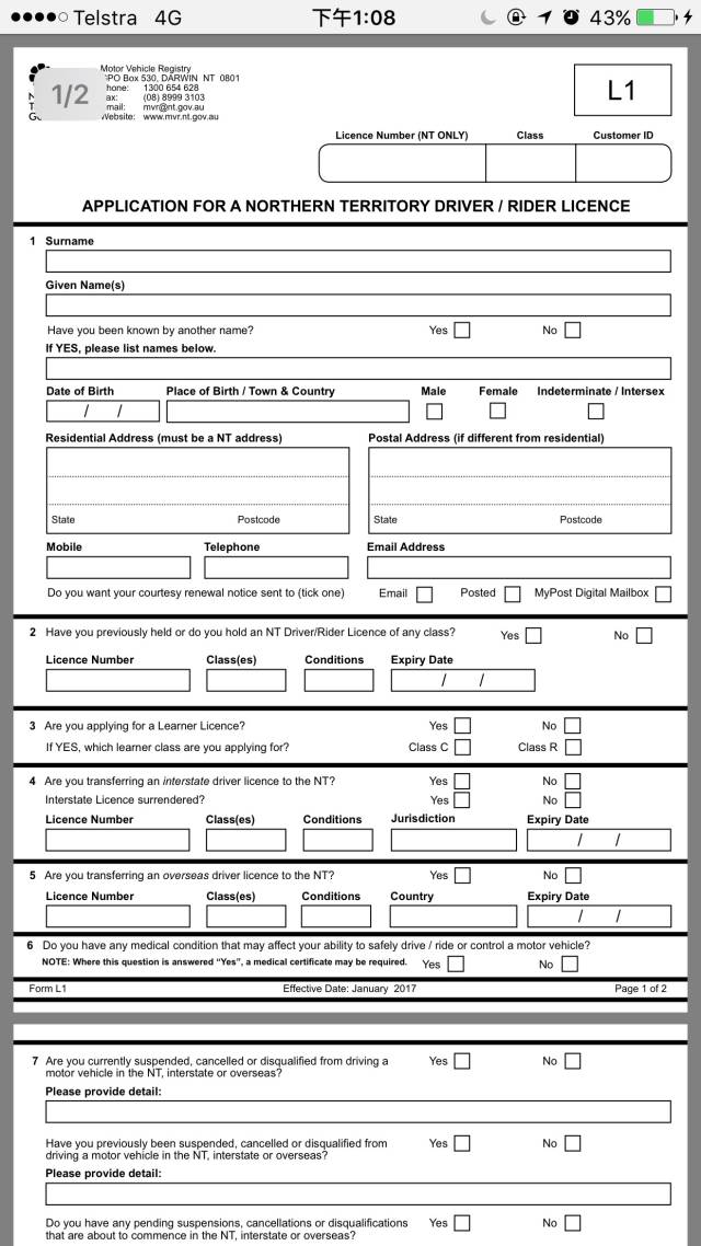 在維州叫Vicroads,在新州叫RTA,在昆州叫transport 等等。各州當(dāng)?shù)氐拇蠹铱梢宰约壕W(wǎng)上搜索。去了之后你和工作人員說(shuō)你要theory test。然后工作人員會(huì)要帶好以下資料和證件(所有的以北領(lǐng)地MVR為例):