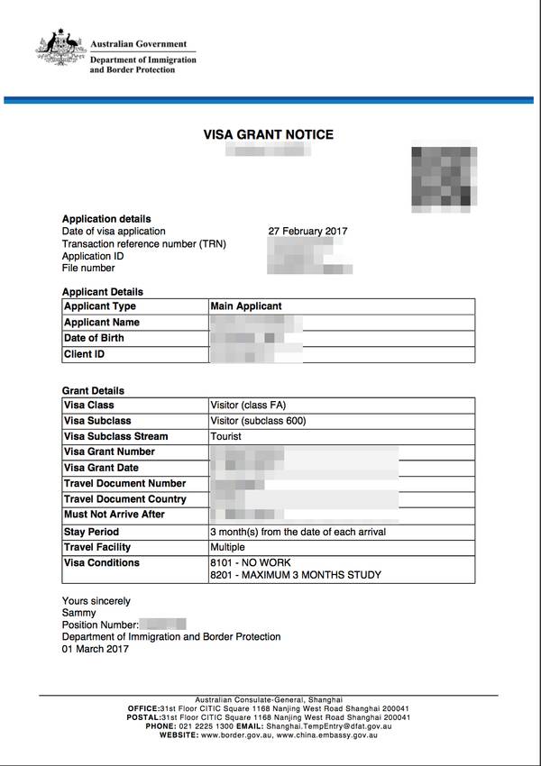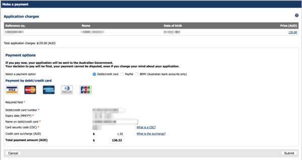 付款:簽證費(fèi)135澳元,如果用visa的話,還要收1.32澳元的手續(xù)費(fèi)