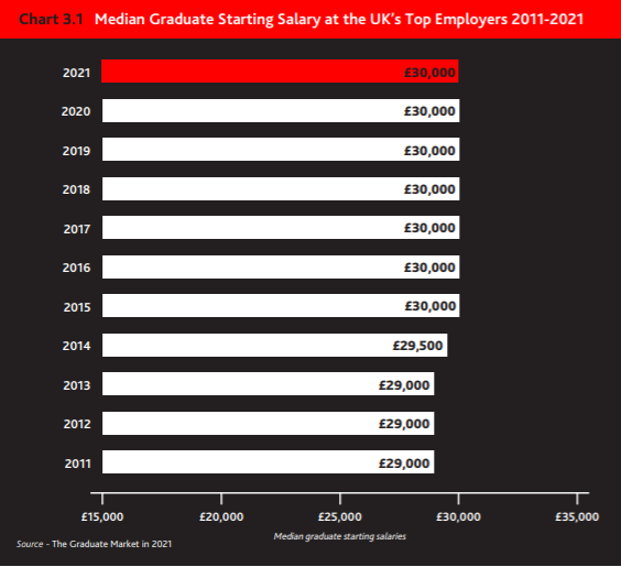 2021年英國巨頭企業(yè)支付的畢業(yè)生起薪中位數(shù)為30,000英鎊,需要注意的是,這個數(shù)據(jù)從2017年開始就沒變過。