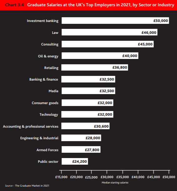 而在薪資對應(yīng)的行業(yè)上,行業(yè)起薪最高的為投行、法律及咨詢行業(yè),分別達到了50,000英鎊、46,000英鎊、45,000英鎊。