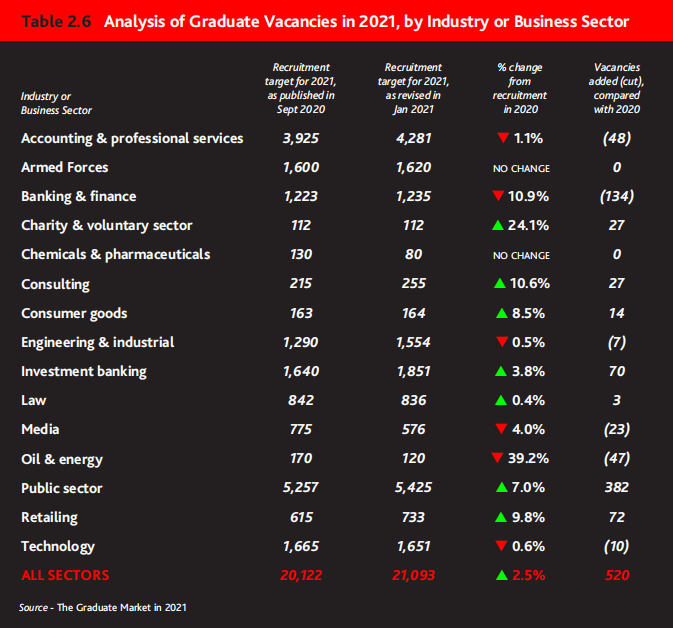 但隨著疫情放緩,有九個行業(yè)和商業(yè)部門的畢業(yè)生招聘目標相較去年有所增加,包括會計和專業(yè)服務(wù)公司、工程和工業(yè)公司、投資銀行和公共部門等。