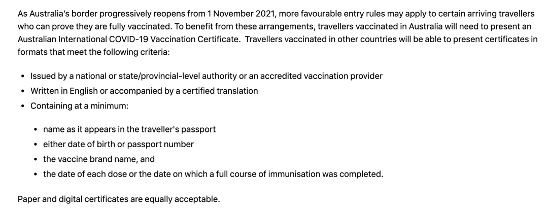 澳洲外交部在其官方網(wǎng)站終于公布了《境外疫苗接種證明指南》,要求在海外接種過(guò)新冠疫苗的旅客及留學(xué)生等,入境澳洲時(shí)提交符合要求的新冠疫苗接種證明。