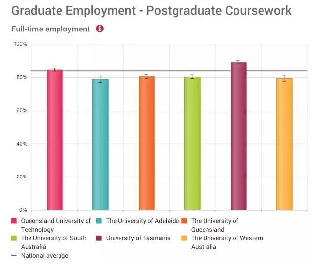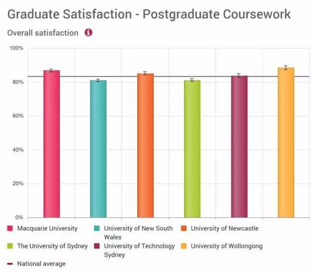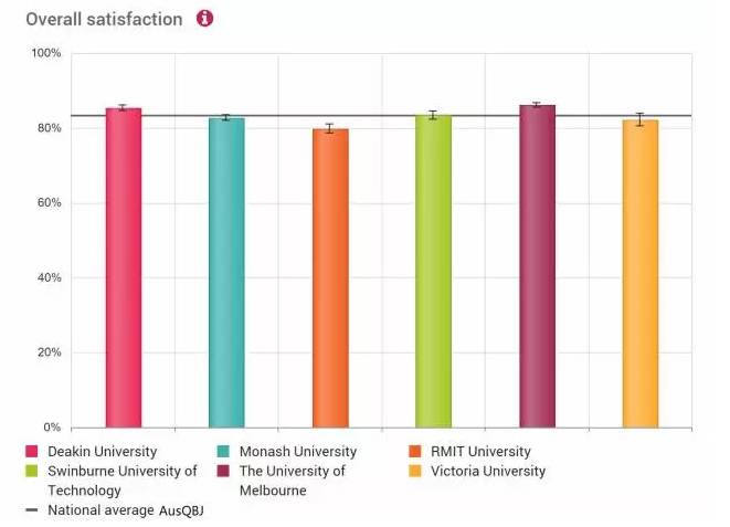 臥龍崗大學(xué):88.4%;麥考瑞大學(xué):86.8%;墨爾本大學(xué):86.1%;迪肯大學(xué):85.4%;紐卡斯?fàn)柎髮W(xué):85.1%;昆士蘭大學(xué):85.0%;QUT: 84.0%;UTS: 83.8%;斯文本大學(xué):83.4%;南澳大學(xué):83.3%;西澳大學(xué):83.0%;莫納什大學(xué):82.7%;維多利亞大學(xué):82.2%;塔斯馬尼亞大學(xué):82.0%;阿德萊德大學(xué):81.9%;新南威爾士大學(xué):80.9%;悉尼大學(xué):81.1%;RMIT: 79.8%
