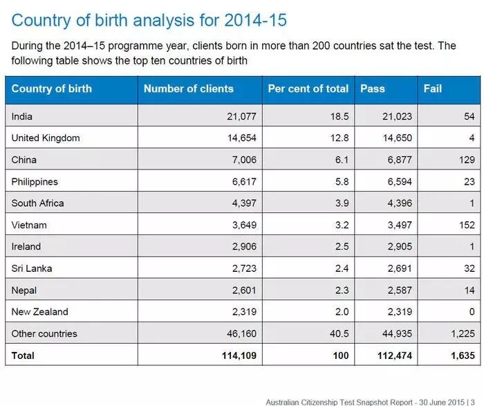 以下是2014-15年度,根據(jù)出生地來看的入籍測試通過及未通過的人數(shù):