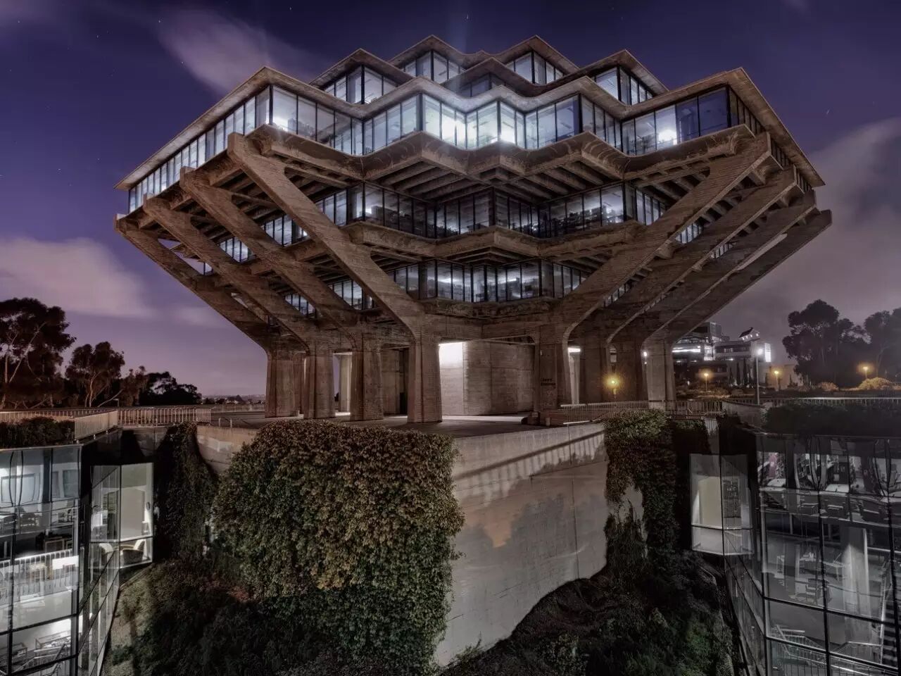 吉賽爾圖書館( Geisel Library)于1970年建成,其名字是為了紀(jì)念Sesus博士,由建筑師William Pereira設(shè)計(jì)。