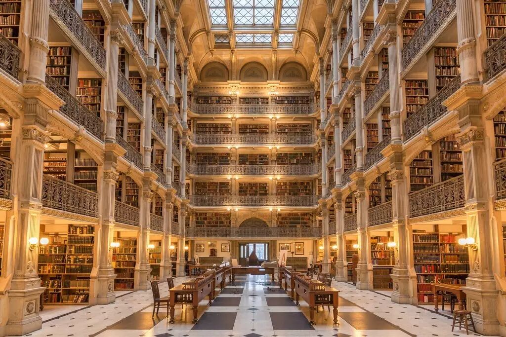 喬治皮博迪圖書館(George Peabody Library)堪稱是“書籍大教堂”,其獨(dú)特而富有藝術(shù)魅力的中庭設(shè)計(jì)讓人流連忘返。廳內(nèi)是黑白相間的大理石地板,兩旁是五排裝飾性鐵欄窗臺(tái),頭頂是網(wǎng)狀天窗。