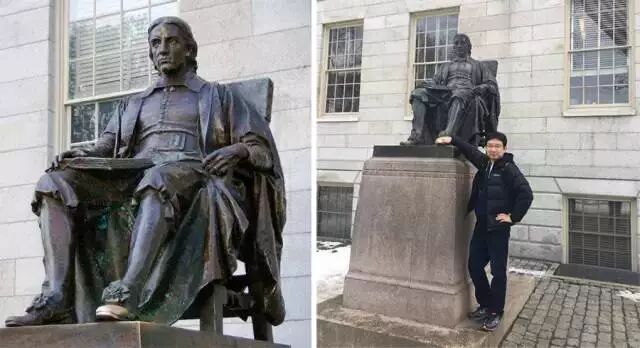 (傳說(shuō)觸摸約翰·哈佛雕像的左腳會(huì)帶來(lái)好運(yùn),于是雕像的左腳被游客摸得金光閃閃)