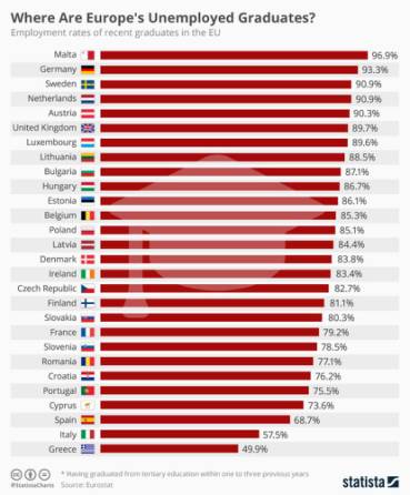 那么歐洲的大學畢業(yè)生面臨著怎樣的就業(yè)形式呢?根據(jù)歐盟統(tǒng)計局發(fā)布的畢業(yè)生就業(yè)數(shù)據(jù)顯示,馬耳他畢業(yè)生就業(yè)率高達96.9%,占據(jù)了全歐洲畢業(yè)生就業(yè)率第一的位置,緊隨其后的是德國和瑞典,分別為93.3%和90.9%。
