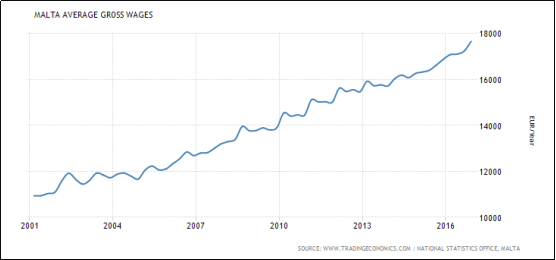 從2001年--2016年年收入增長走勢圖及馬耳他官方公布的數(shù)據(jù)來看,馬耳他2016年底的人均年收入已達到17666.35歐元。