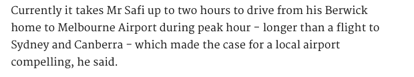 薩菲表示,往常從他家Berwick開(kāi)車(chē)前往泰勒馬林機(jī)場(chǎng)需要兩個(gè)小時(shí),這比悉尼飛堪培拉的航班所用時(shí)間都長(zhǎng)。