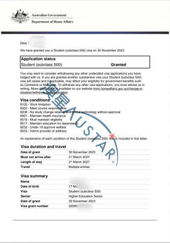 小楊同學(xué)最終決定去悉尼大學(xué)的,開學(xué)時間是在2024年2月。因為12月中旬開始澳洲全國都要進入圣誕節(jié)和新年假期,簽證中心的審理速度也會比較慢,如果簽證批得比較晚,學(xué)生訂機票和找住宿都會比較緊張。為了不耽誤時間,我們馬上開始為小楊同學(xué)準(zhǔn)備遞交學(xué)生簽證的材料和手續(xù),爭取趕在圣誕節(jié)前能出簽,便于她的后面的安排。