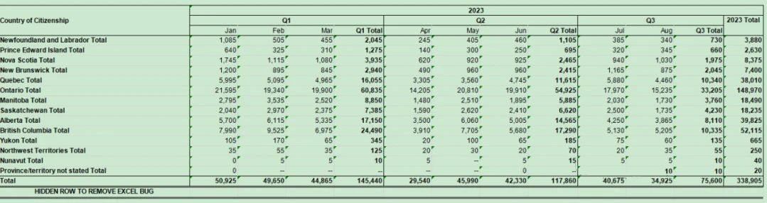 2023年1月,加拿大新增永久居民50,925人,這一年開(kāi)始后,每月移民人數(shù)逐漸減少,在未來(lái)三個(gè)月內(nèi)下降了42%,4月份新增永久居民僅為29,555人。