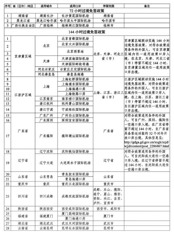 中國實(shí)施72/144小時(shí)過境免簽政策的城市詳見下表:
