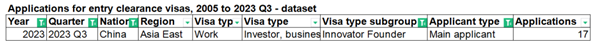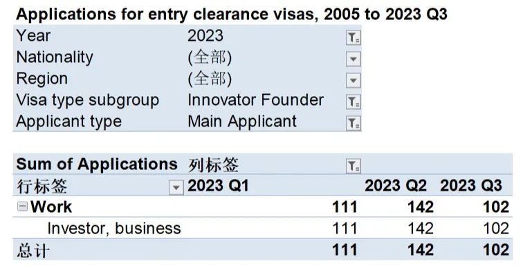 從上文數(shù)據(jù)可以看出,2023年第三季度,創(chuàng)新創(chuàng)始人簽證共計遞交102人,其中中國大陸遞交17人,獲批15人。