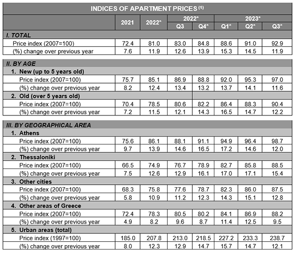 按區(qū)域數(shù)據(jù)分析來看,2023年第三季度,雅典公寓價格同比上漲12.0%,塞薩洛尼基上漲15.4%,其他大城市上漲12.8%,希臘其他地區(qū)上漲9.5%。2022年全年,上述地區(qū)價格平均分別上漲13.9%、12.6%、10.9%和8.2%(修訂數(shù)據(jù))。最后,對于全國所有城市地區(qū),2023年第三季度公寓價格較2022年第三季度平均上漲12.1%,而2022年年增長率為12.3%(修訂后的數(shù)據(jù)) 。