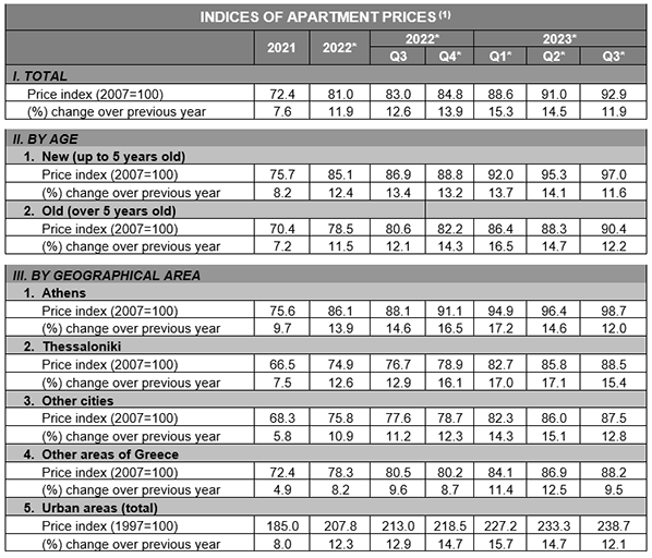 按區(qū)域數(shù)據(jù)分析來看,2023年第三季度,雅典公寓價格同比上漲12.0%,塞薩洛尼基上漲15.4%,其他大城市上漲12.8%,希臘其他地區(qū)上漲9.5%。2022年全年,上述地區(qū)價格平均分別上漲13.9%、12.6%、10.9%和8.2%(修訂數(shù)據(jù))。最后,對于全國所有城市地區(qū),2023年第三季度公寓價格較2022年第三季度平均上漲12.1%,而2022年年增長率為12.3%(修訂后的數(shù)據(jù)) 。