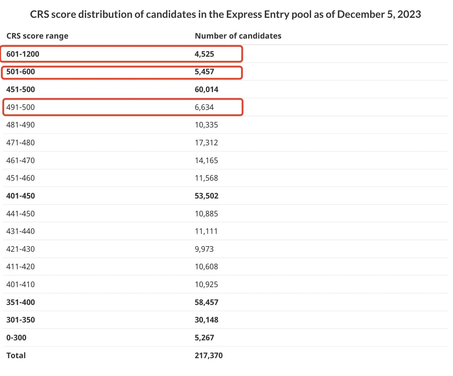 目前,IRCC正在努力處理池中的快速通道候選人。池中候選人分數(shù)和人數(shù)分布情況如下: