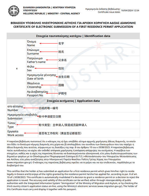*希臘白紙也就是臨時居留證明,是移民申請人在線提交申請后收到的一張電子回執(zhí),包含申請人個人信息,遞交居留申請后一般40天內(nèi)簽發(fā),相當于之前的“藍紙”,該等待紙也將直接發(fā)送至居留申請人的郵箱內(nèi)。詳見下圖: