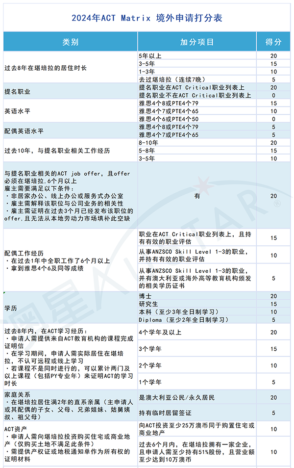澳大利亞自1979年以來一直采用打分制來吸收移民,ACT有自己單獨的系統(tǒng)---Matrix打分表,與別的州EOI打分表有所不同。Matrix打分表對于申請人在堪培拉的居住時間、工作offer、配偶情況有著額外的關(guān)注,特別利好大齡夫妻檔。