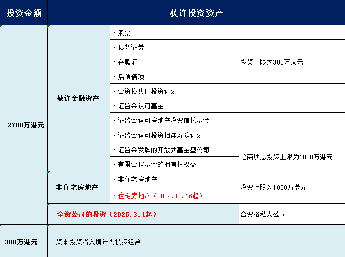 2024年10月16日起,容許投資住宅物業(yè),該物業(yè)成交價須為港元5000萬元或以上,投資于房地產(chǎn)獲計算入投資總額上限為港元1000萬元;
