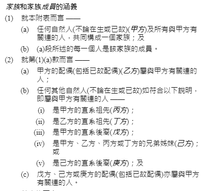 總的來說,與主申請人(甲方)有關(guān)連的所有任何人,都是其家族成員。具體包含: